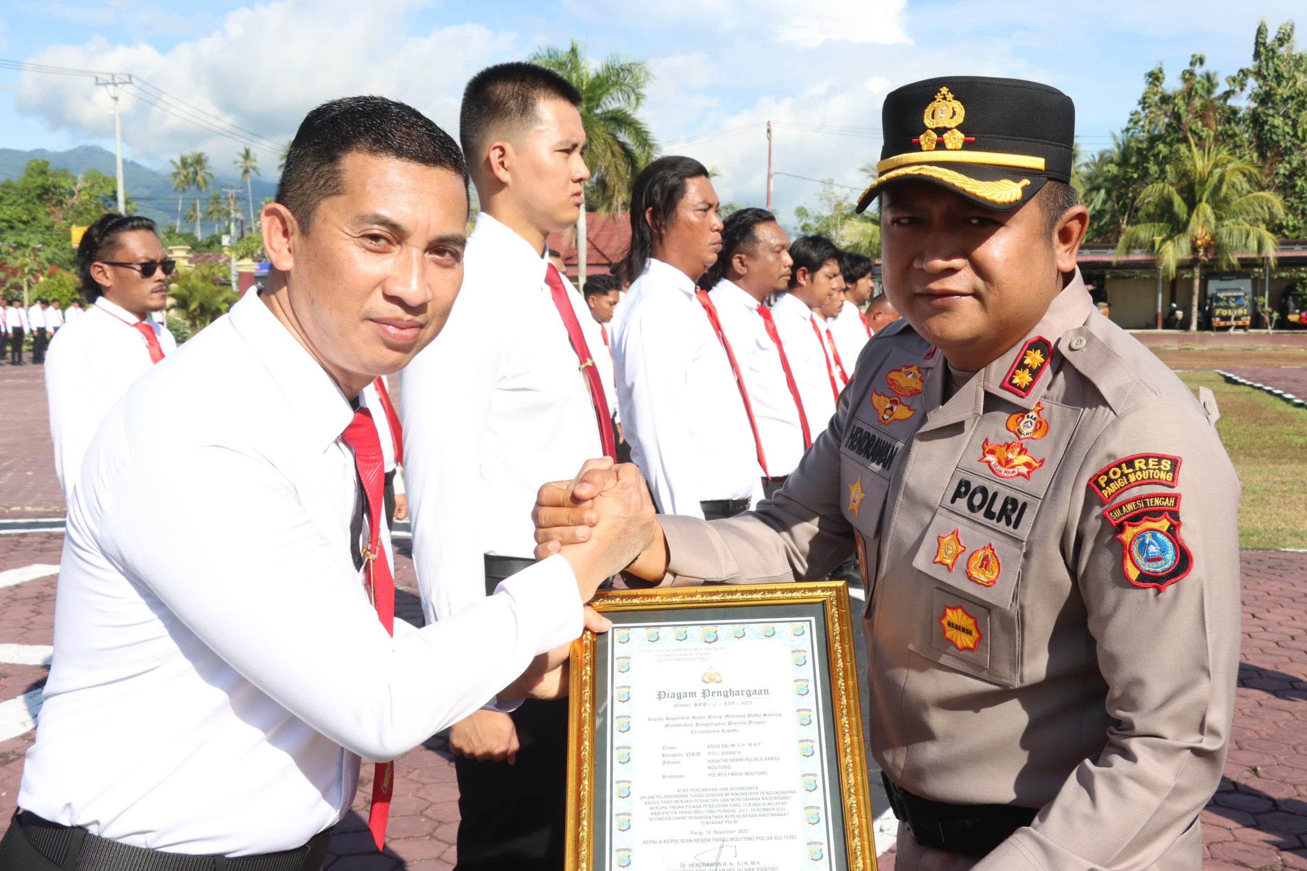 Apresiasi tersebut diberikan langsung oleh Kapolres Parimo AKBP Dr. Hendrawan A.N., S.I.K., M.H. dalam bentuk piagam penghargaan kepada personel berprestasi saat apel Jam Pimpinan di halaman Mako Polres, Senin (15/12).