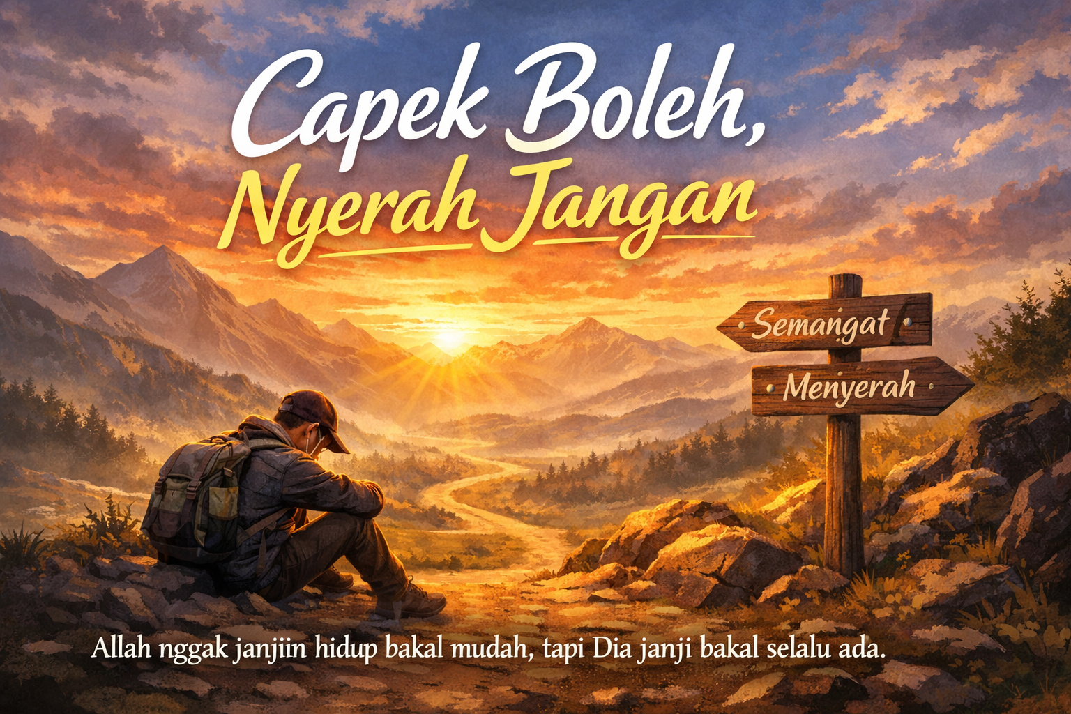 Namun dalam kondisi seberat apa pun, satu hal yang harus selalu dipegang adalah jangan pernah menyerah. Boleh saja kita berhenti sejenak untuk beristirahat, tetapi jangan sampai kehilangan harapan untuk melanjutkan langkah.